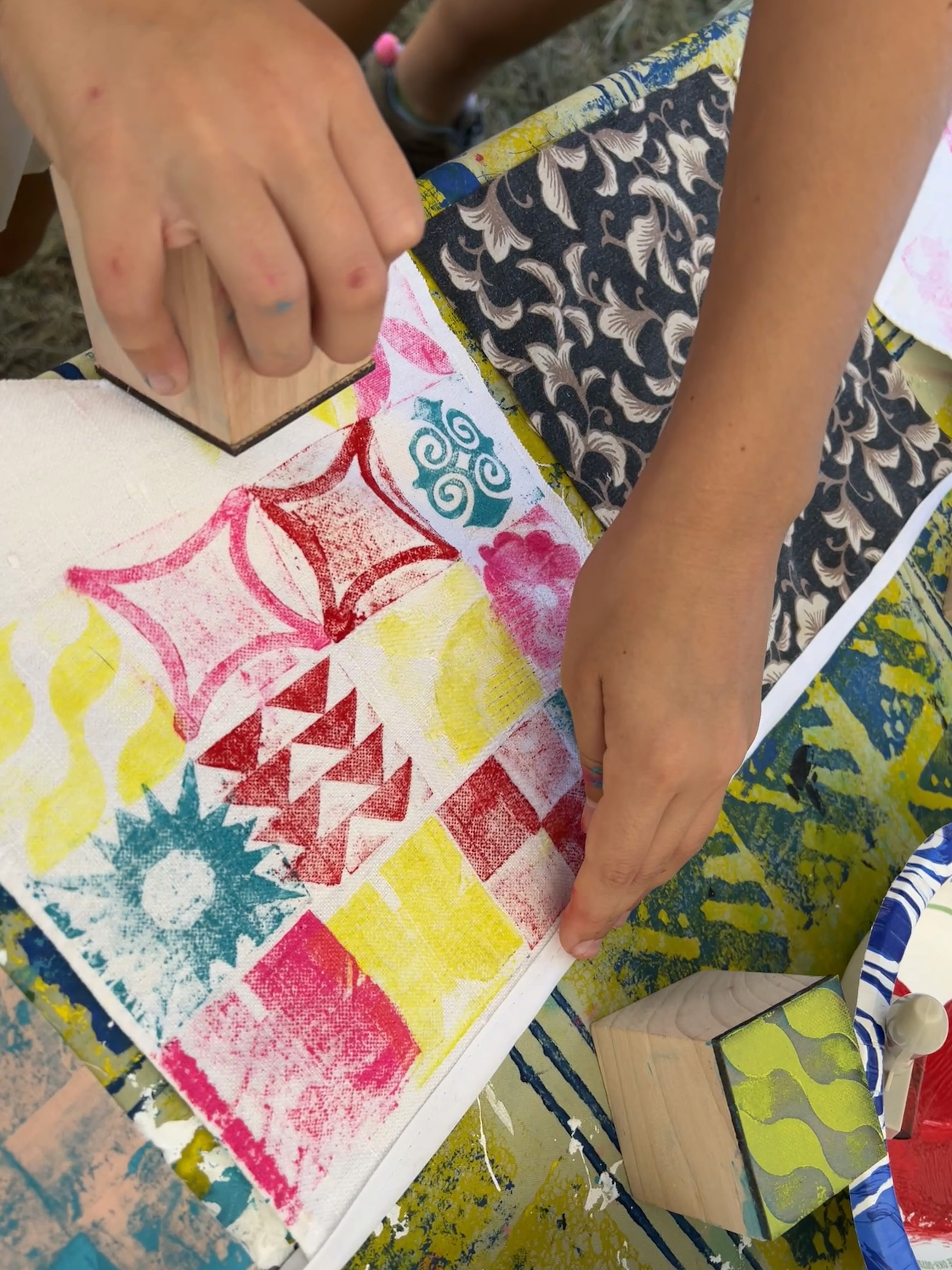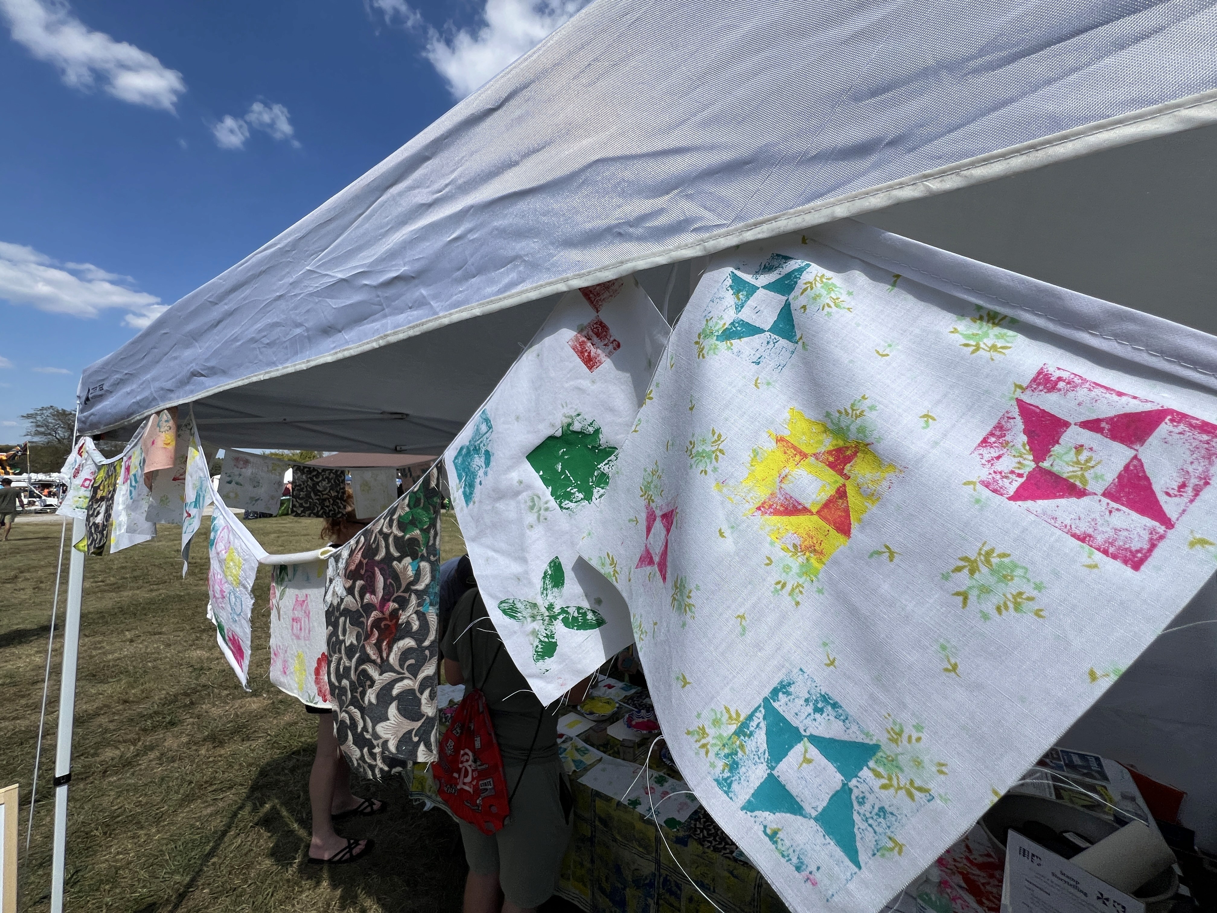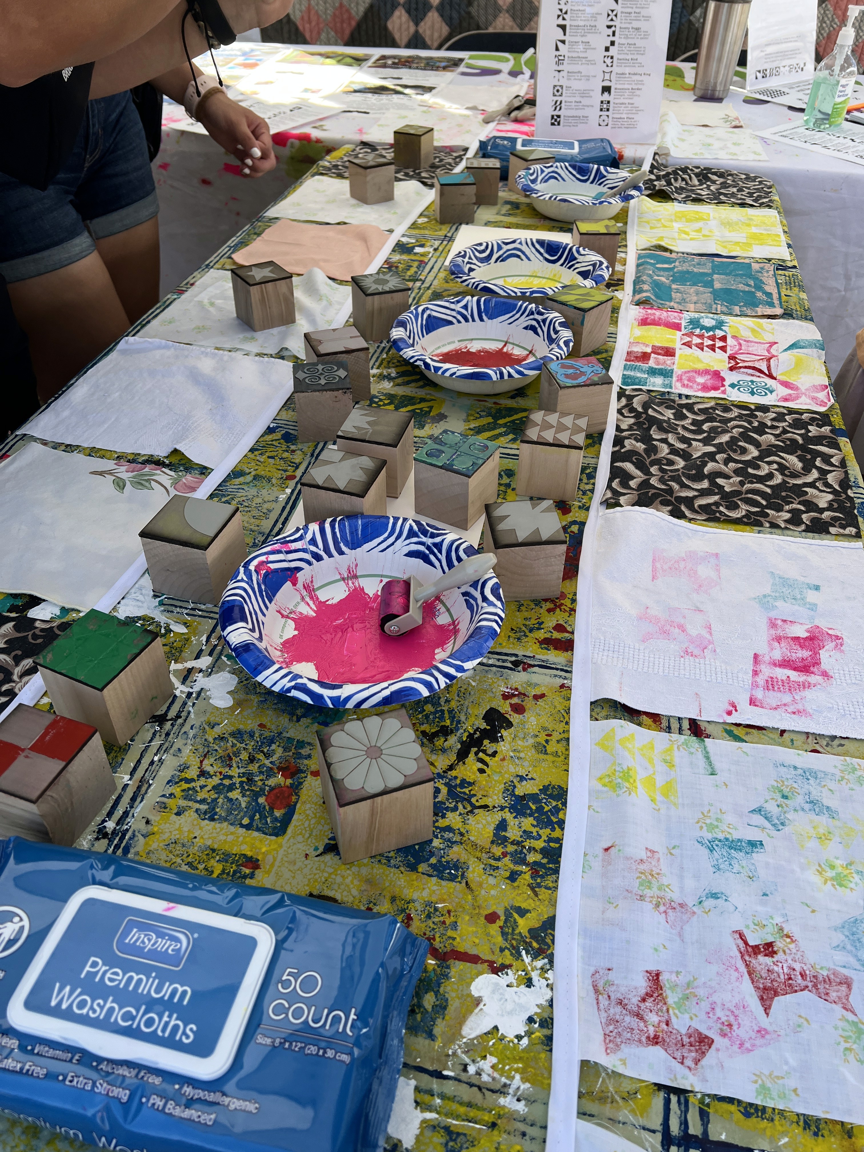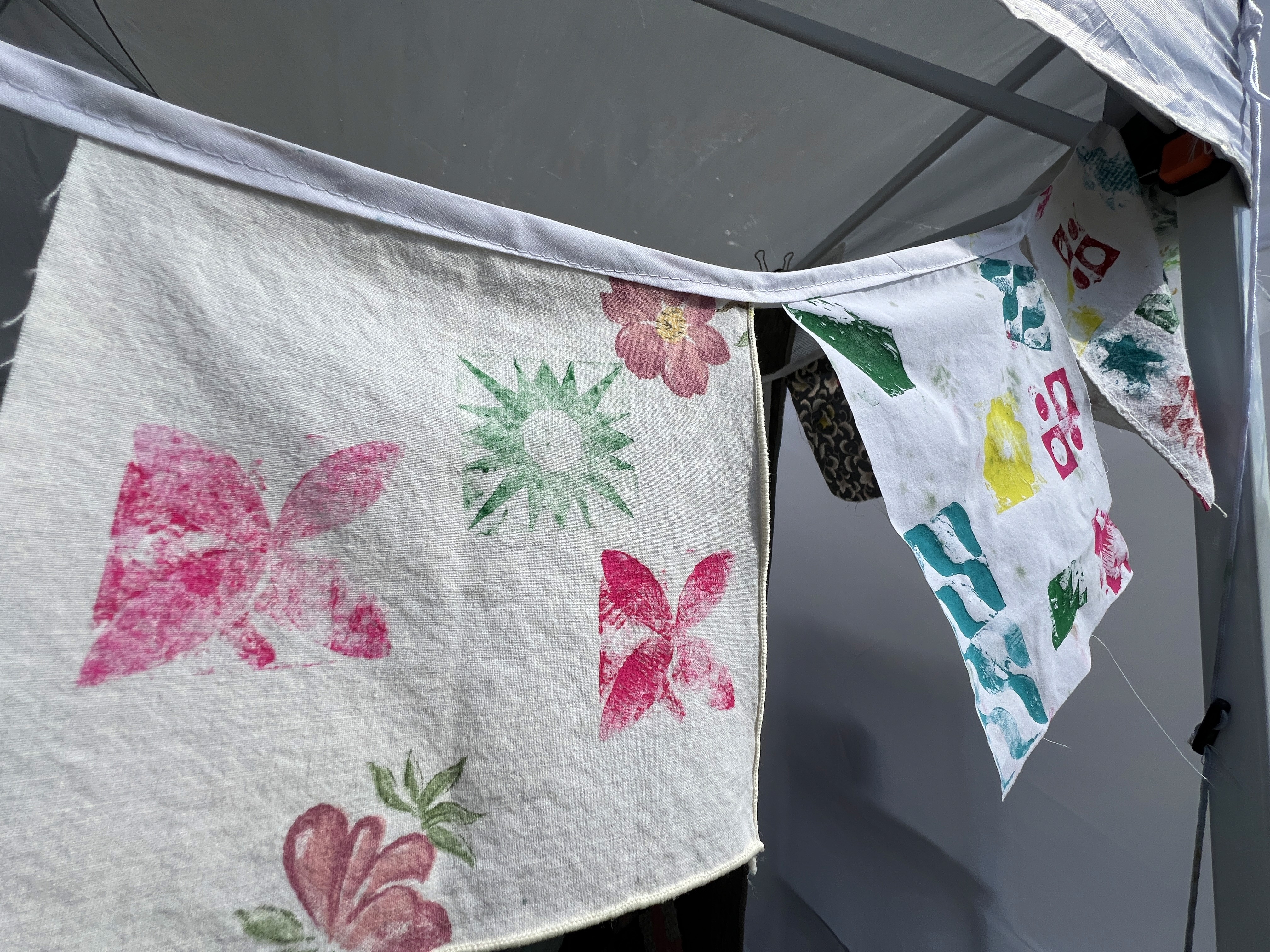 Participating artists use stamps with quilt block patterns to create their own quilt square! Regional and international quilting patterns are translated for participants to understand what the symbol means, and then create their own stories while paying homage to past quilters. Participating artists create their artwork on a square of fabric attached to a bunting banner. When all squares on the bunting banner are filled, it is hung and displayed.