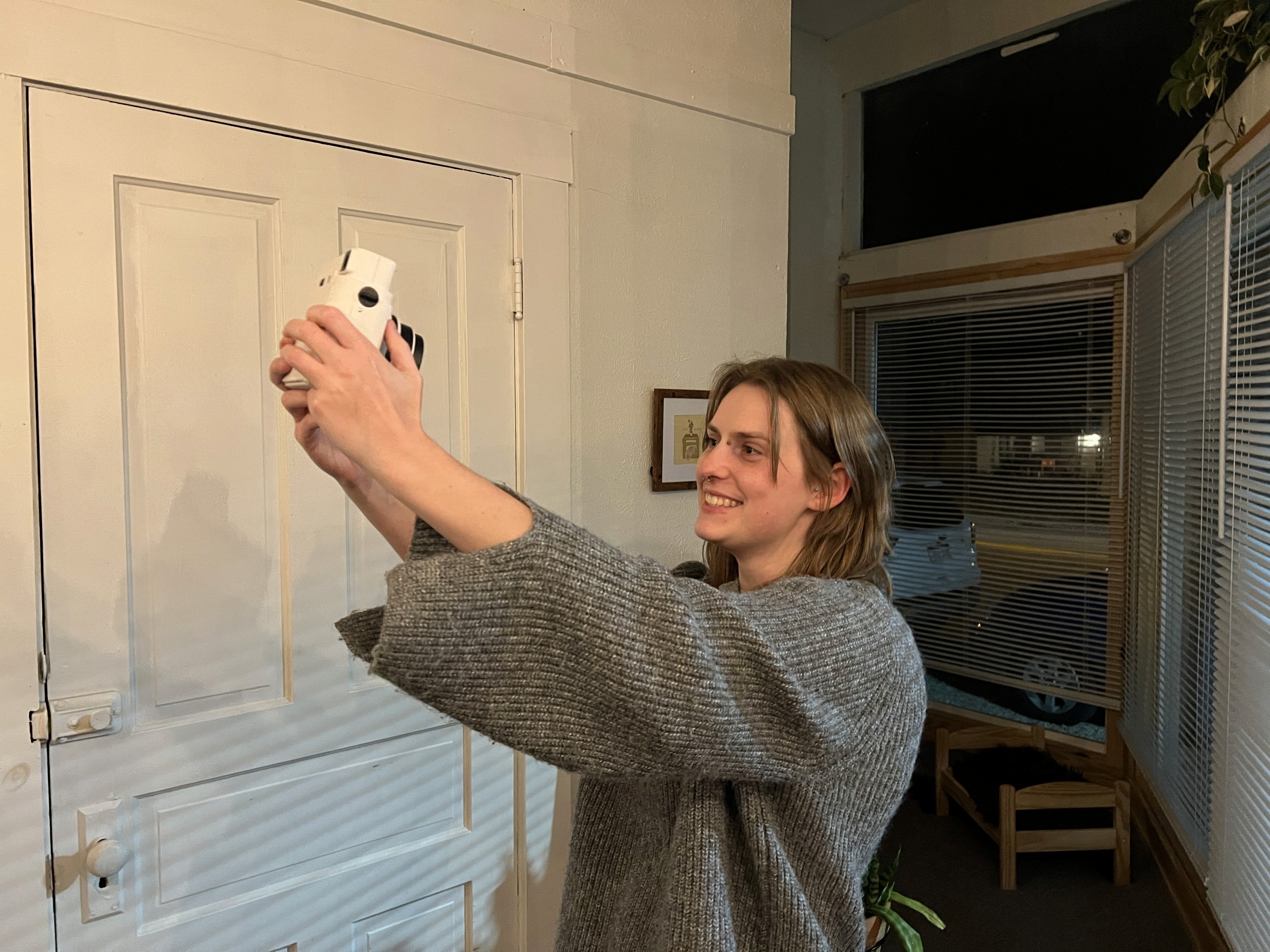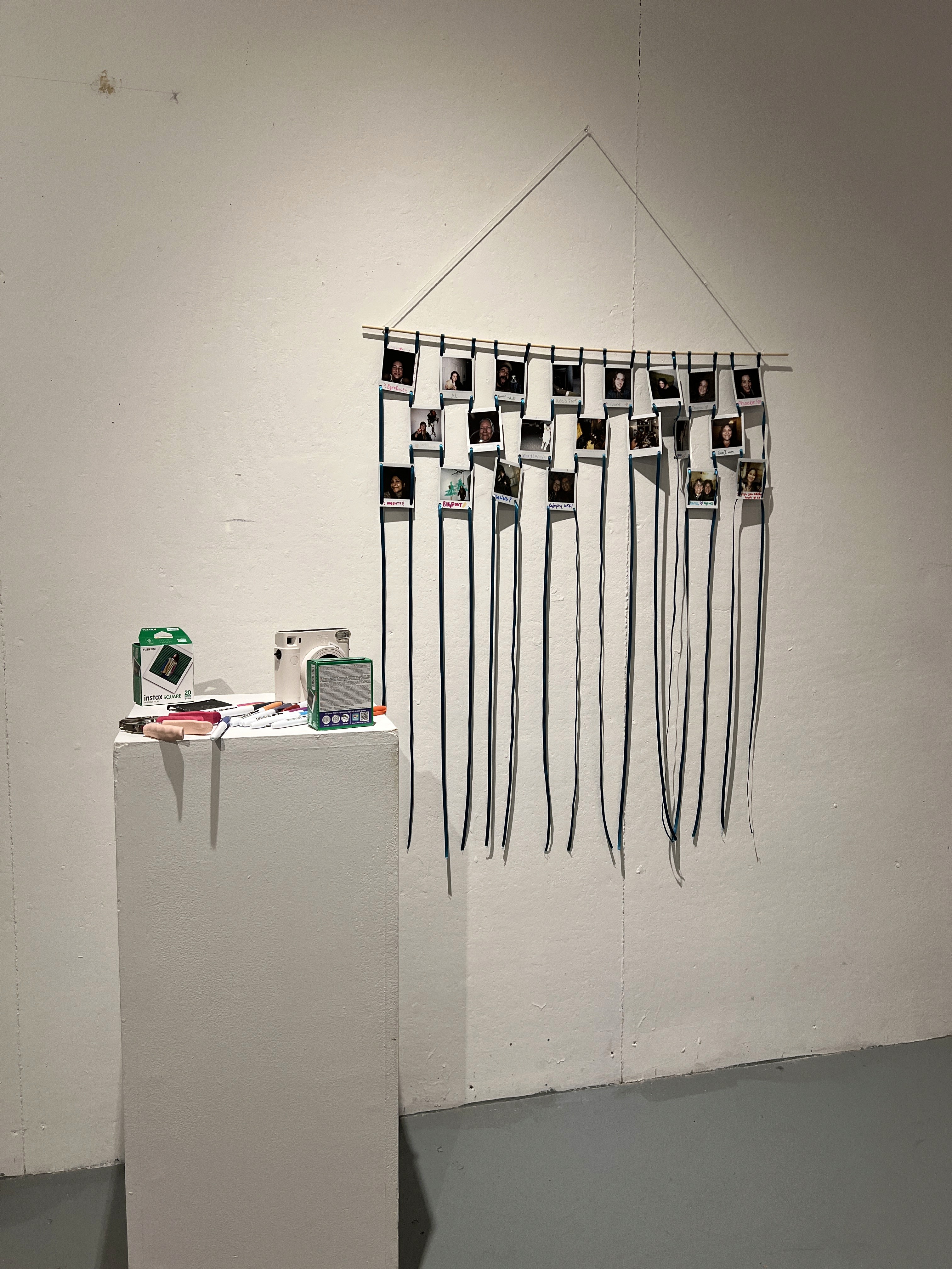 Participating artists take instant film photos of themselves, their friends, or anything of interest. Artists then add doodles, words, etc. to their photo, use a hole puncher to create four holes in the corners of the photo, and weave it into the hanging device. When completed, the photos become quilt squares showcasing the community!