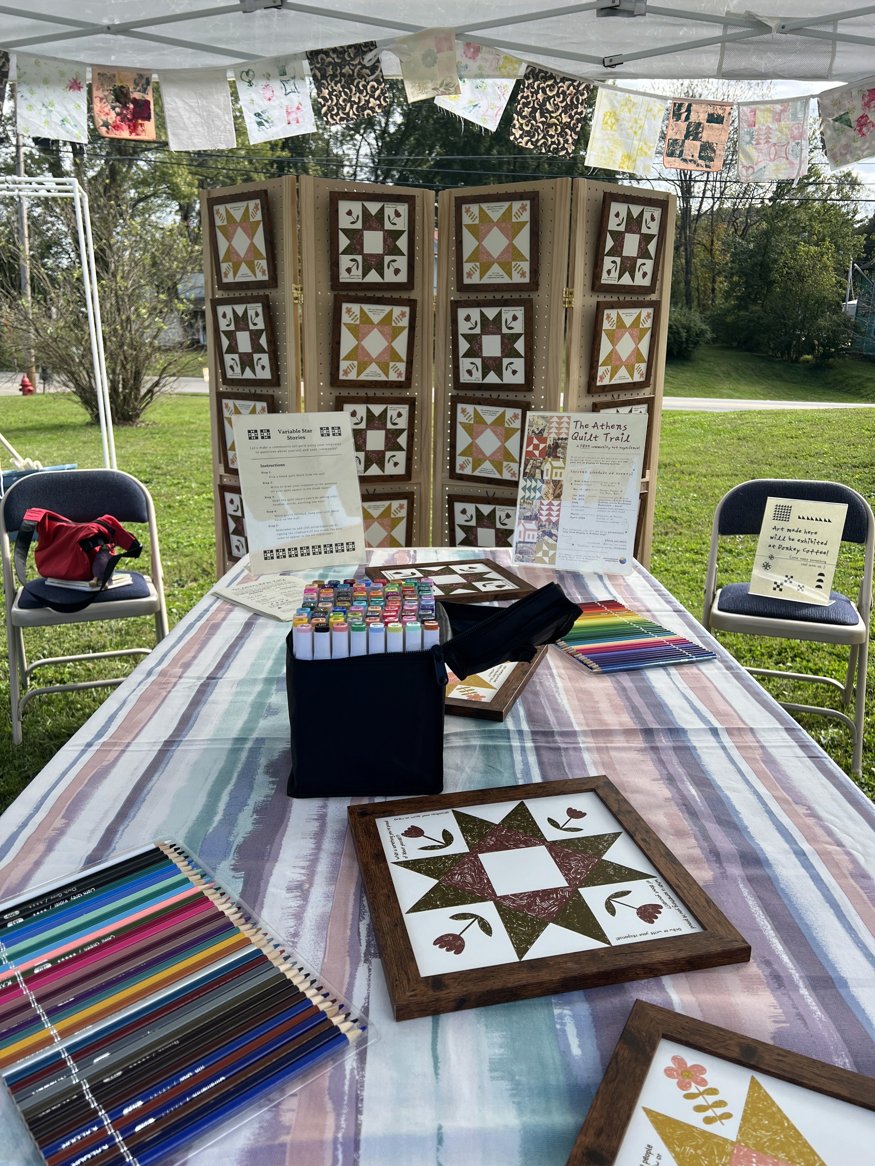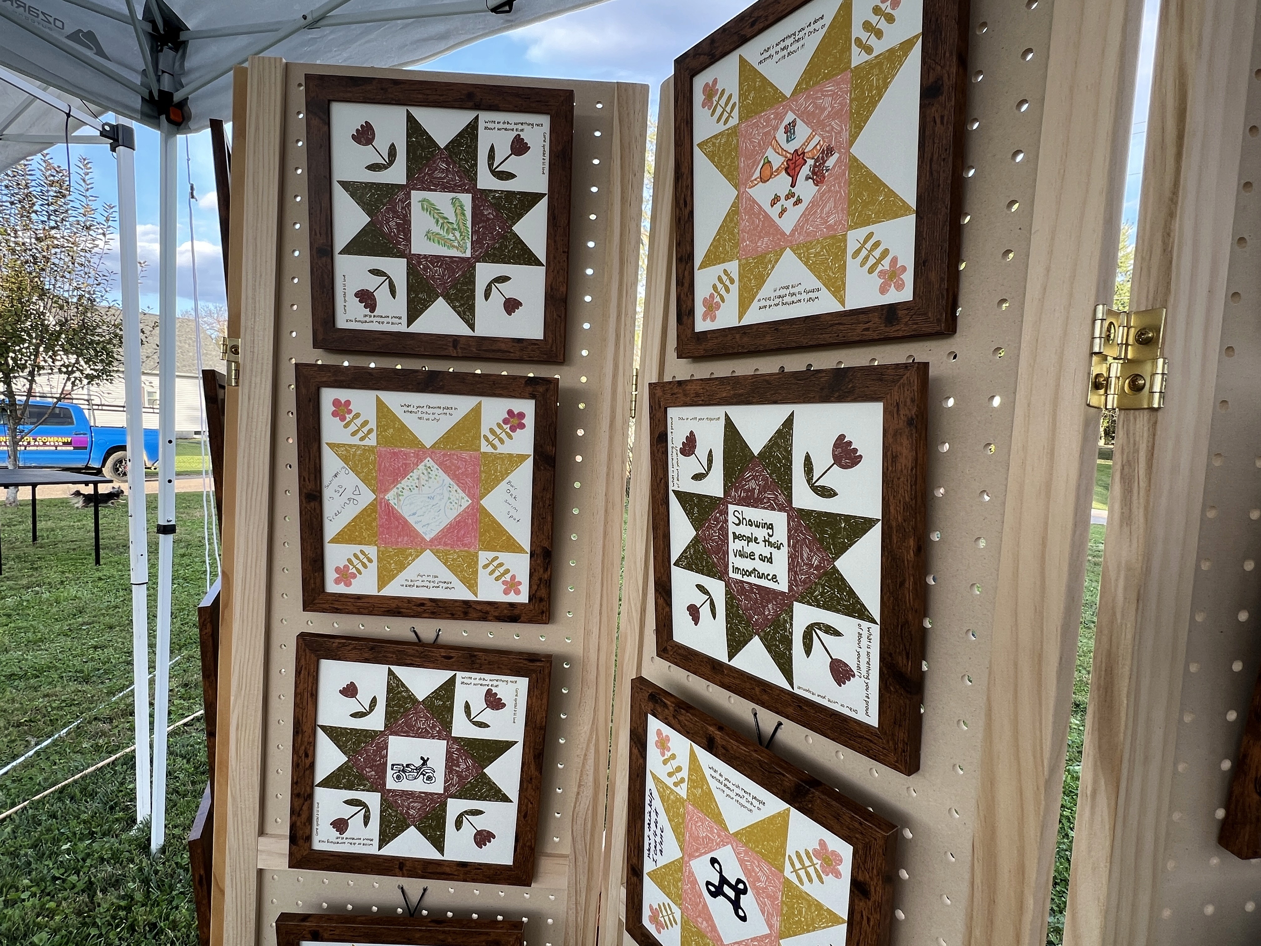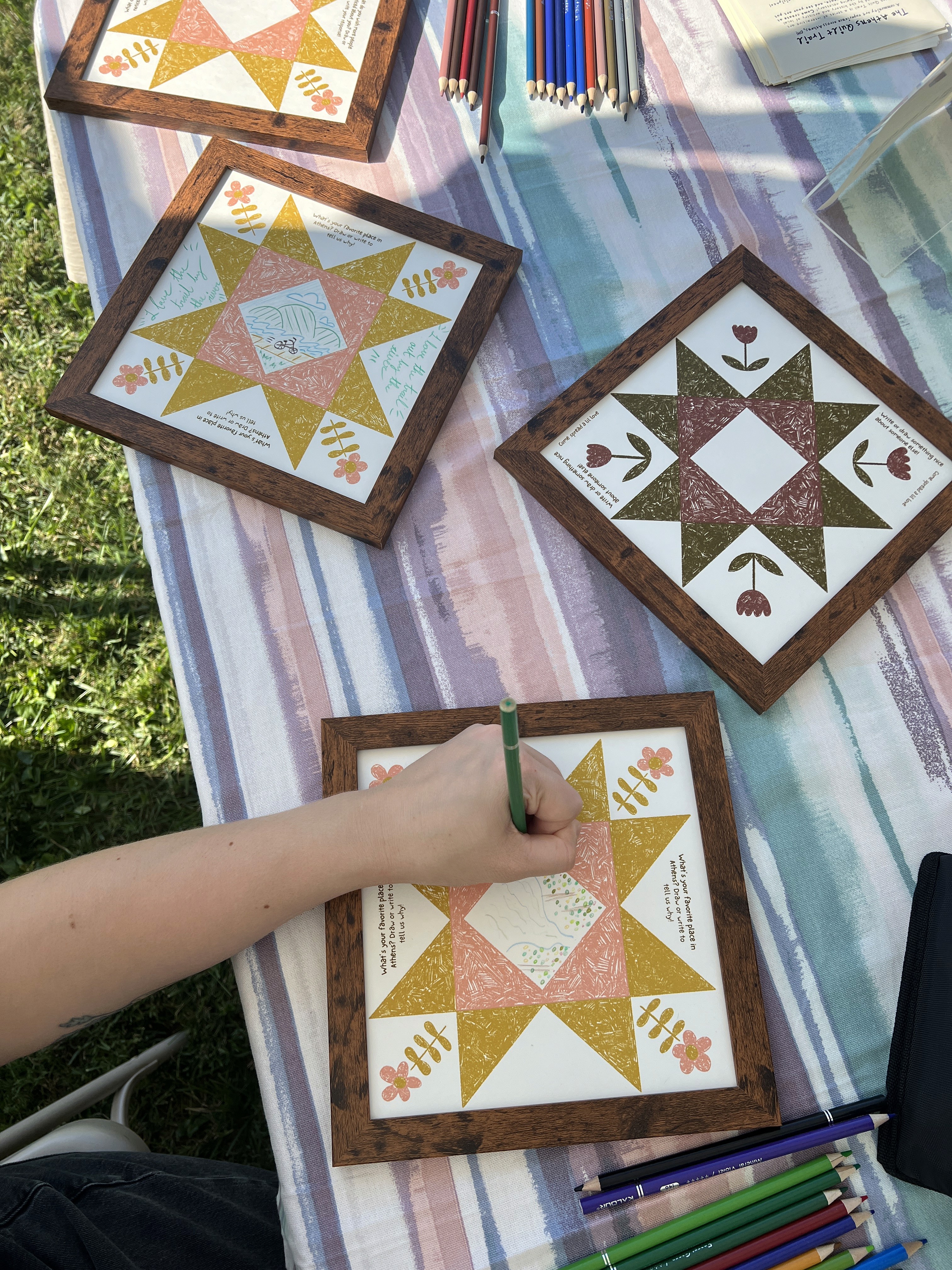 Participant artists first select a Variable Star quilt block from a display of multiple blocks. They then respond to a prompt about themselves and their community within the star pattern through drawing, writing, or whatever feels right! The finished piece is then added back to the wall of other responses, allowing viewers to experience the thoughts and feelings of their fellow community members.